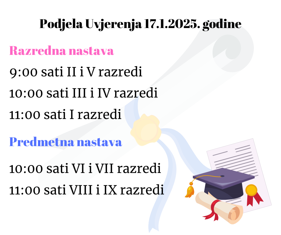 Dragi učenici, poštovani roditelji podjela Uvjerenja za prvo polugodište školske 2024/25. godine će biti u petak 17.1.2025. godine prema sljedećem rasporedu:
